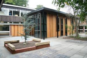 time of this project. Therefore reclamation and recycling was very high in the priority of the designed structure. A steel frame with timber framing and cedar cladding were all chosen for their potential reuse along with their inherent design characteristics. The proposal used tall window elements from some of the windows within the listed building and timber cladding to echo that of the science block. The project was completed in a very short period of time through the summer recess and was commended by the local authority conservation architect upon completion.